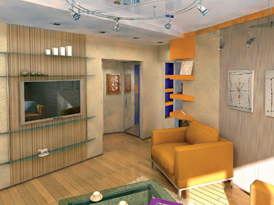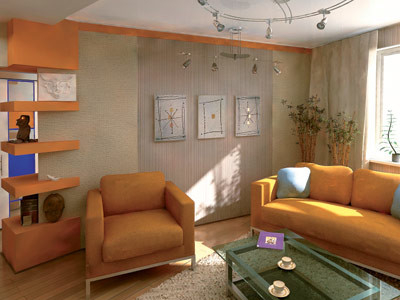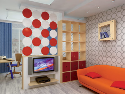 Можно оформить стену композицией из полок, покрашенных в яркий апельсиновый цвет. Для этого подходят гипсокартон с металлическими профилями или ДСП и MDF