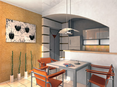 Контрастное противопоставление темной и светлой дакоративной штукатурки помогает подчеркнуть архитектурные формы помещения