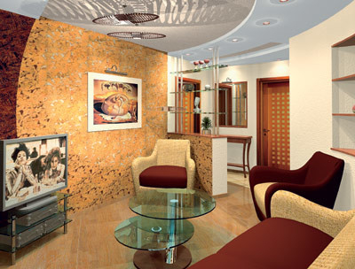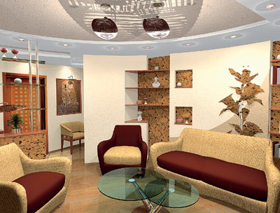 Ниши оклеиваются листами пробки. Ана оштукатуренной поверхности из нее выполняется оригинальная аппликация в виде цветов. Натуральные природные материалы- дерево, пробка- вносят в интерьер тепло