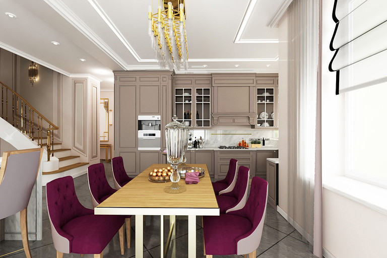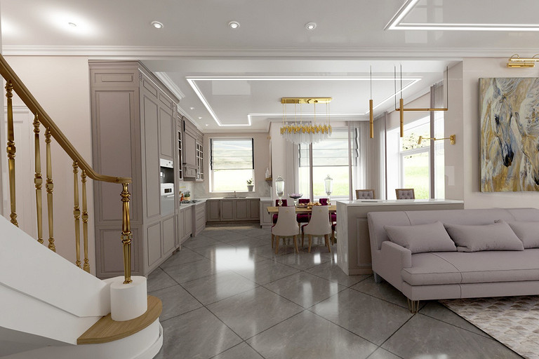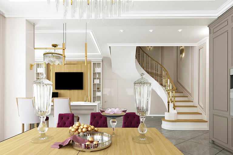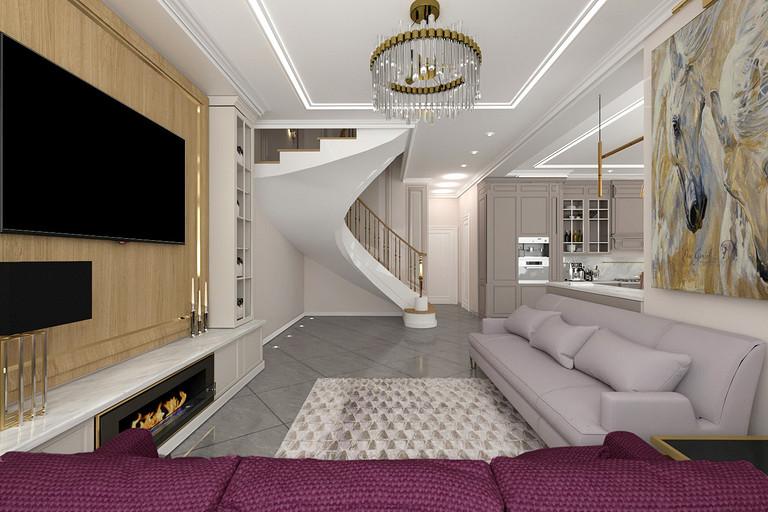 Светлая гостиная загородного дома в коттеджном поселке «Подмосковные просторы».