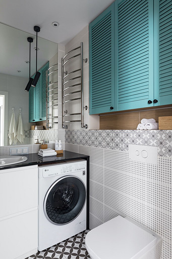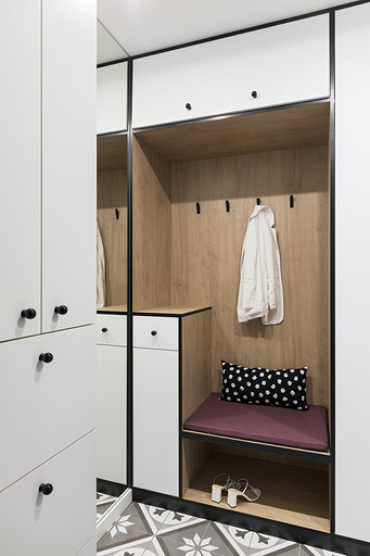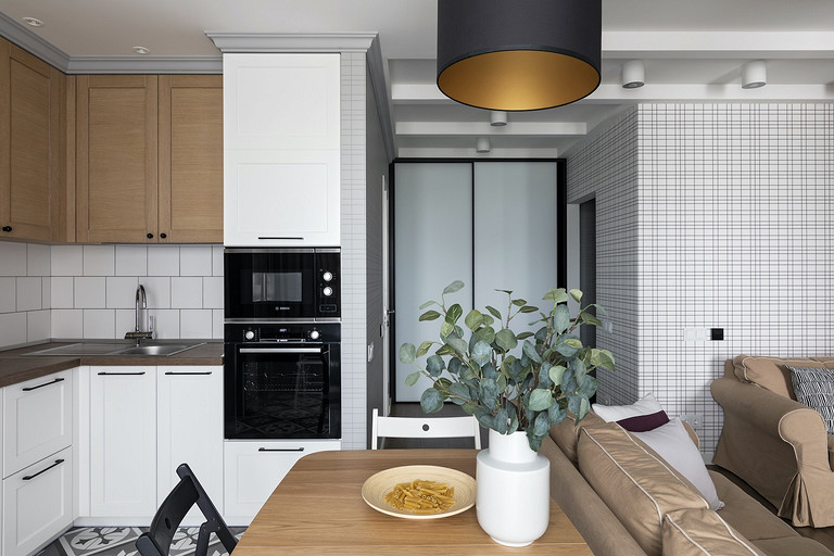 - Пол: плитка в прихожей и кухне Dual Gres, ламинат в жилой зоне Kaindl, плитка в ванной комнате Opoczno, Cersanit