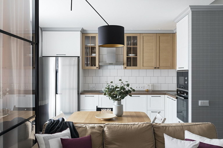 - Мебель: стулья, журнальный столик, шкаф в спальне, мебель для рабочей зоны — ИКЕА, обеденный стол, кровать — Signal, корпусная мебель — индивидуальное производство на местных фабриках