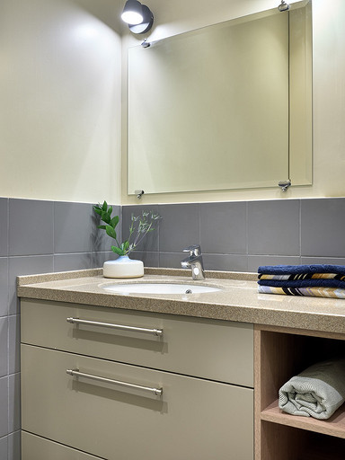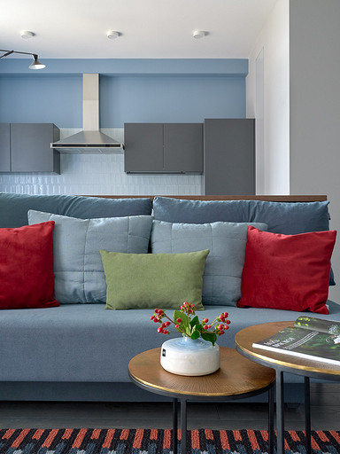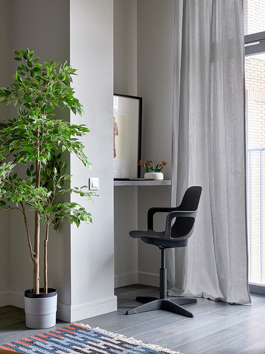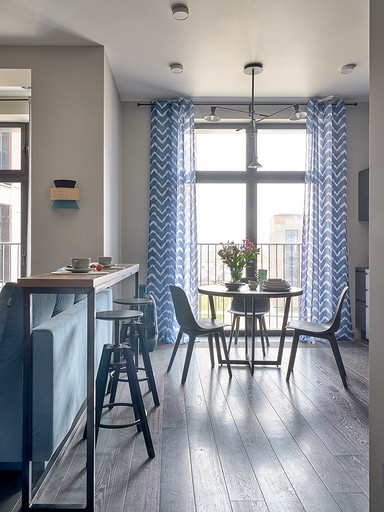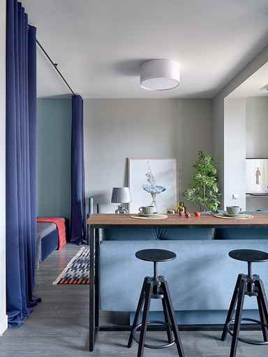 - Мебель: мягкая мебель и обеденный стол — divan.ru, барные стулья, кухонные стулья, компьютерный стул — ИКЕА, журнальные столики Dantone Home, корпусная и встраиваемая мебель, мебель в ванной под заказ по чертежам дизайнера (выполнение «Твой стиль»), тумба в гостиной — собственность заказчика