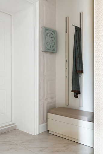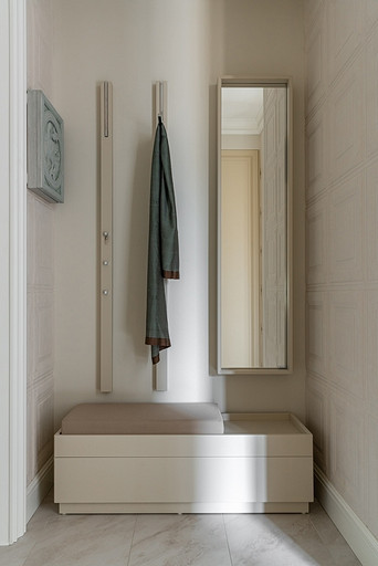 - Мебель: банкетка, вешалки, зеркало, плечики Schönbuch, шкаф в нише Loftmark, фурнитура Furnitek