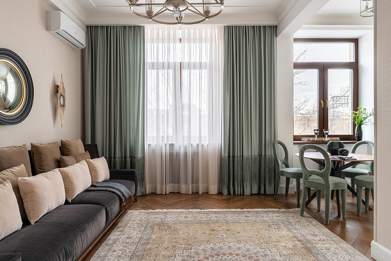 - Текстиль: портьеры из шерстяной ткани цвета «утиное яйцо» с меланжевой кисеёй — на заказ