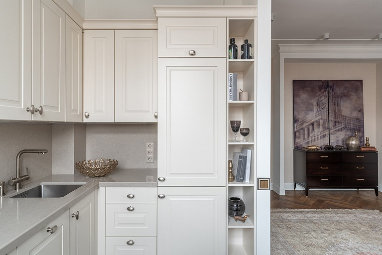 - Бытовая техника: холодильник Liebherr, варочная панель, духовка, вытяжка, посудомоечная машина Bosch