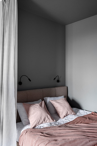 - Декор: плед и крючки на стене H&M Home, шторы у кровати ИКЕА, шторы на окне из ткани «Леруа Мерлен», постер — печать на холсте (куплен с рук)