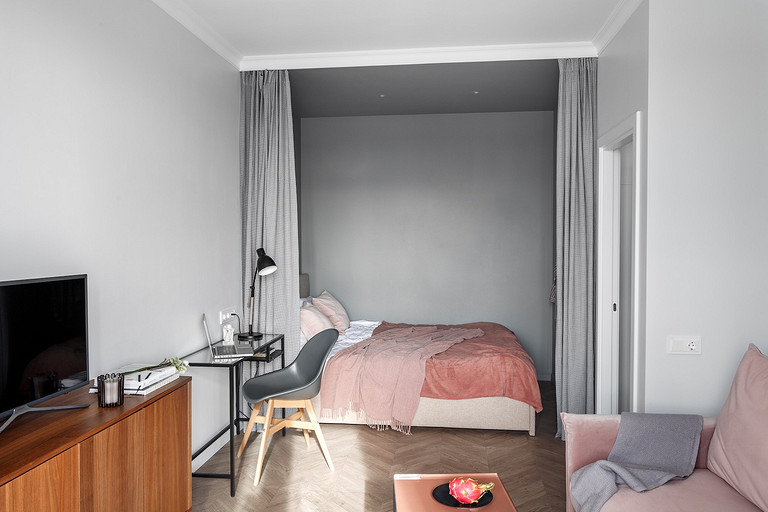 - Мебель: диван Letti Bene, кровать «Аскона», тумба под ТВ — ИКЕА, журнальный столик La Redoute, стол для ноутбука и стул ИКЕА