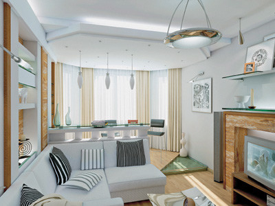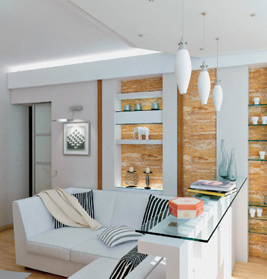 Квартира обставлена простой по формам, но стильной и современной мебелью. Выразительные акценты в гостиной- набор красивых светильников в виде стилизованных цветочных букетов