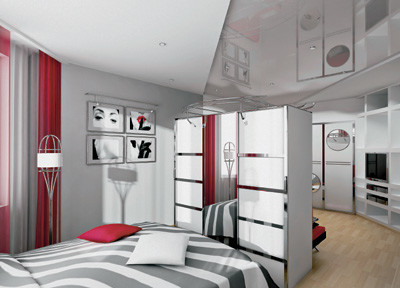 Удачно выбрана единая для обоих помещений цветовая гамма, которая включает белый, серый, красный и серебристый цвета