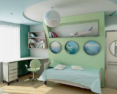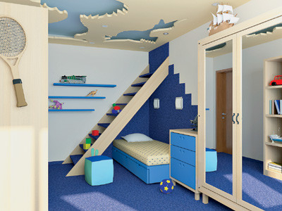 Под лесенкой в детской- пещера "лесного разбойника", которого здесь ни за что не найдут родители. Вподшивном потолке вырезаются силуэты животных и специально подсвечиваются