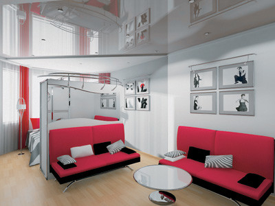 Вгостиной на общем светлом фоне равномерно распределены крупные красные акценты