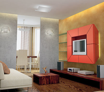 Благодаря темному фону (пробка) ниши с полками кажутся более глубокими. Интерьер гостиной не перегружается деталями, а его сдержанная цветовая гамма позволяет привлечь внимание к хорошо продуманным декорациям