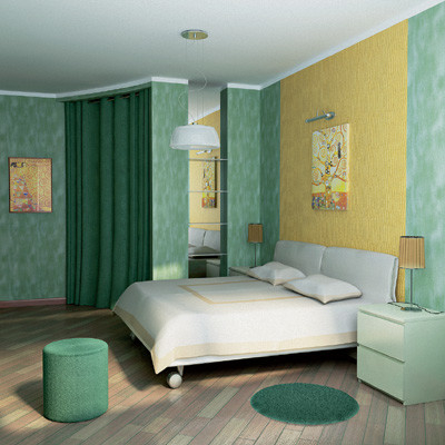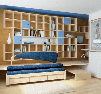 с помощью сделанной на заказ мебели: подиума, в котором «прячется» кровать, и криволинейного стеллажа