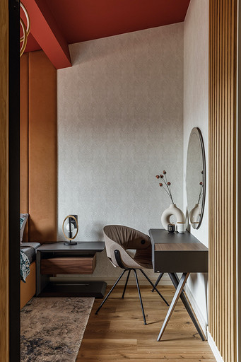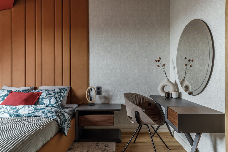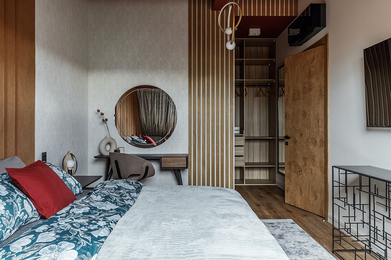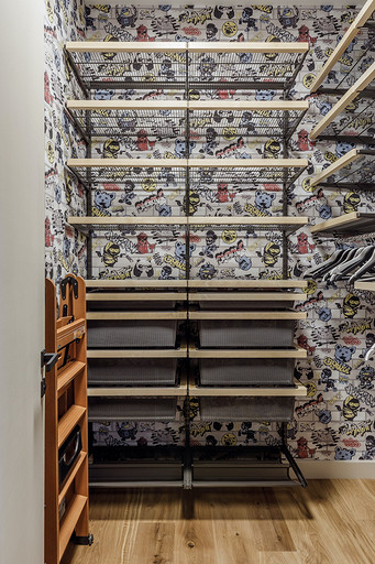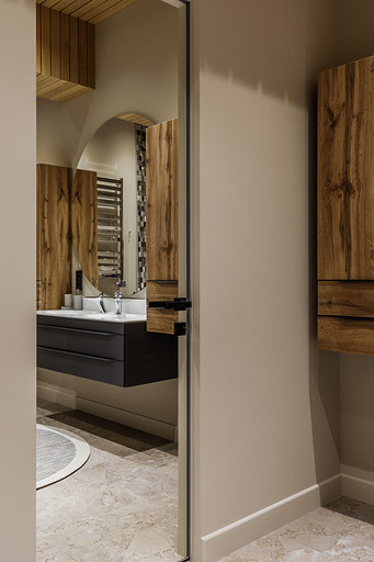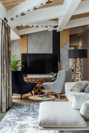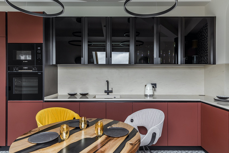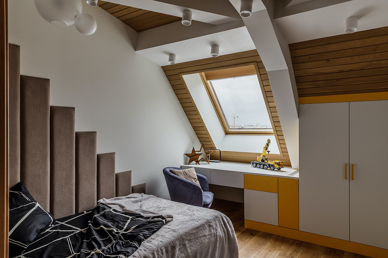 - Мебель: встраиваемая мебель Raumplus, кухонный гарнитур «Стильные кухни», диван Koinoor, комод под ТВ Tonin Casa, кресло Rom, стулья на кухне Tonin Casa, стол обеденный Wood craft studio, мебель в спальне Catellan, детская гардеробная Elfa