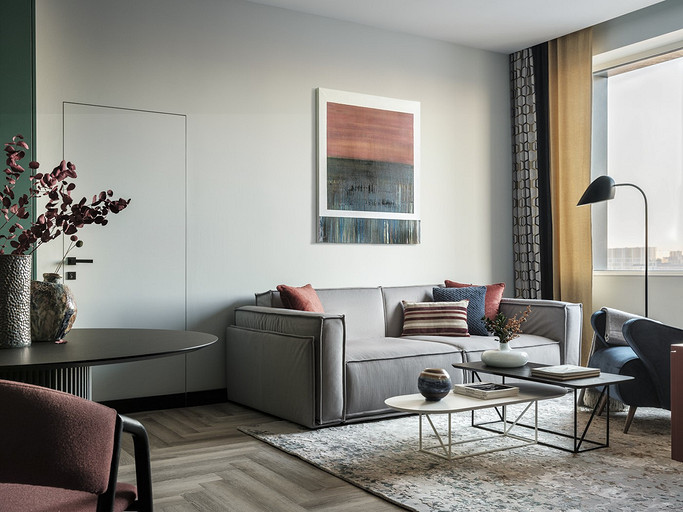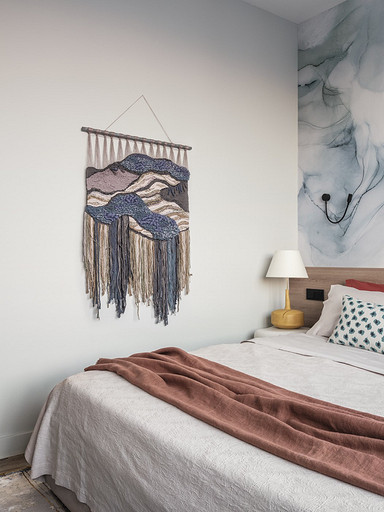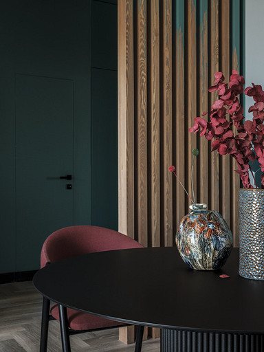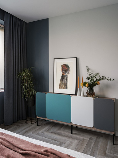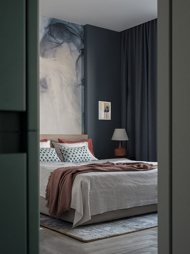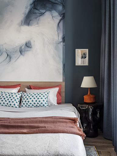 - Декор: на комоде — картина, автор Зорикто Доржиев «Легенды осени», на стене — акварель, автор Юля Мартынова, ваза Barcelona Design, подсвечники Designboom
