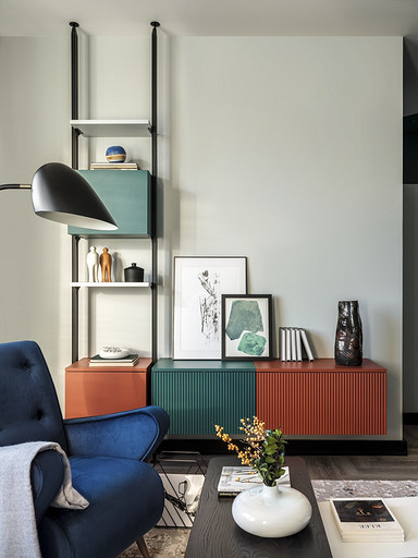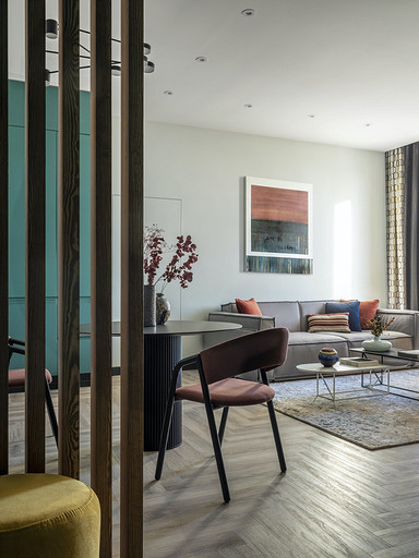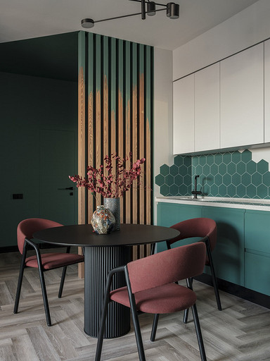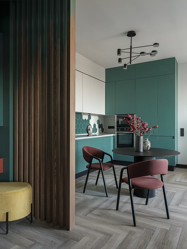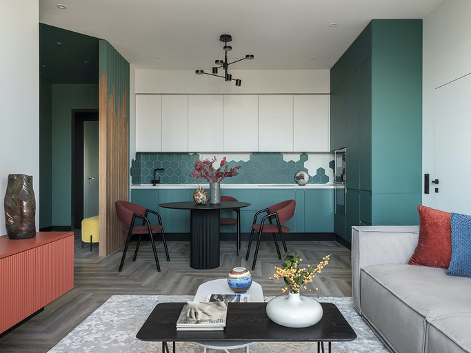 Зеленый, синий, фоновый серый и цветные акценты — дизайнер использовала яркие краски и создала комфортный и функциональный интерьер для семейной пары с маленьким ребенком. Читать далее...