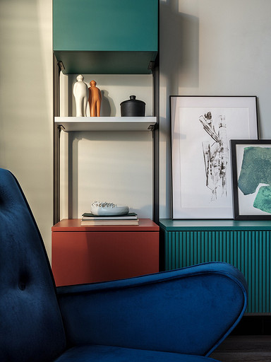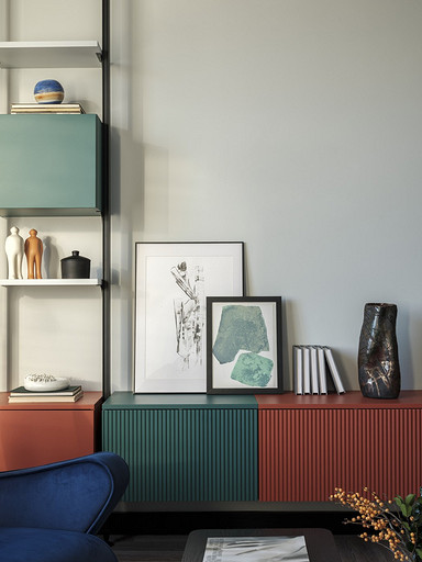 - Декор: картина над диваном «50/50» (художник — Саша Хуяк, галерея Art Brut Moscow), картины на комоде (Софья Пятницкая, серия Connections, литография — галерея печатной графики The Personal), ваза крупная (авторская керамика, Оксана Панфилова, галерея Savour), ваза круглая наверху (авторская керамика, Лена Орехова, галерея Savour), арт-объект на стеллаже (авторская керамика, Наташа Бедрединова), на столе: высокая (Светлана Осипова), низкая (авторская керамика, Мария Грановская, галерея Savour), тарелка на кухне — Designboom