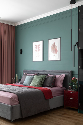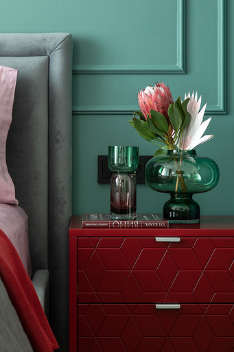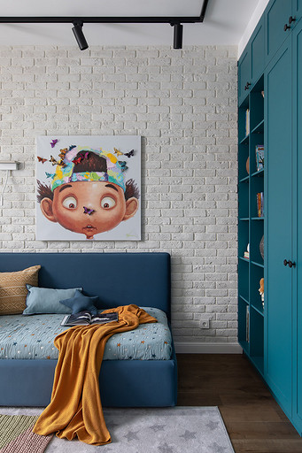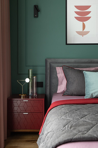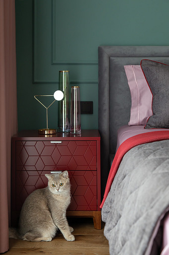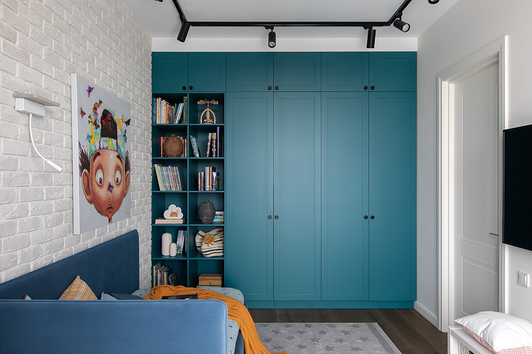 - Мебель: кровать и матрас — Askona, тумбы — The Idea, стул Le Home, комод, столик и шкаф — на заказ по чертежам автора проекта в Wespec