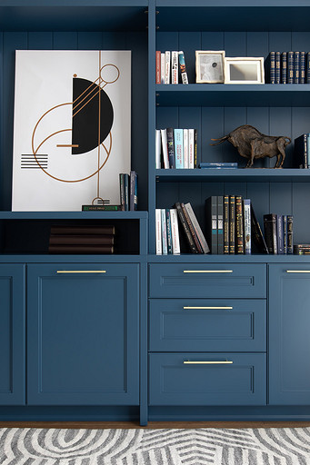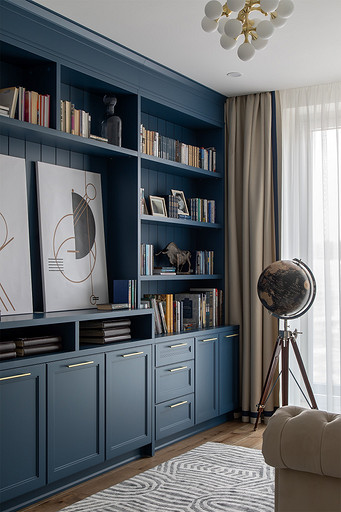 - Мебель: диван Le Home, библиотека на заказ по чертежам автора проекта в Wespec