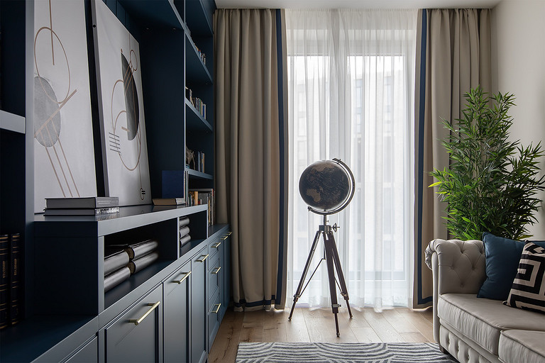 - Аксессуары и декор: напольный глобус и дерево Kare Design, на стеллаже — авторские постеры Алексея Риттенберга и декор Kare Design