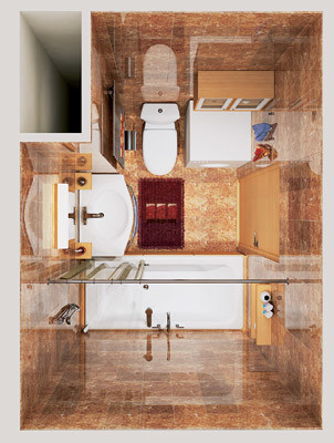 Вванной дверь, мебель и полочки покрываются светлым шпоном, что придает оформлению помещения законченность