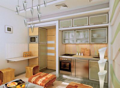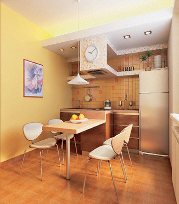 Ниши с подсветкой, в которые отлично вписалась кухонная мебель, возникли за счет объемного гипсокартонного короба,