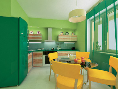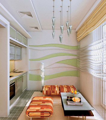 Объемную композицию с волнообразными ступенями несложно выполнить из листов гипсокартона, наложенных друг на друга и покрашенных в разный цвет. Простому, но выразительному рисунку вторят драпировки кухонных штор