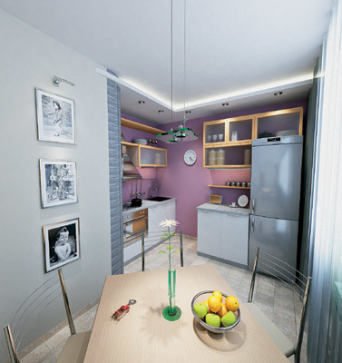 Благородный темно-сиреневый цвет стен в нише зрительно делает ее более глубокой и расширяет пространство кухни