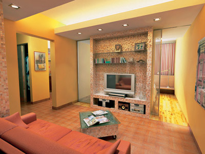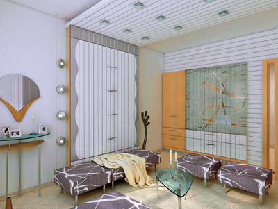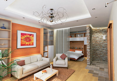 с диваном выделена выступом панели. Она продолжается на потолке, где в нее встроены точечные светильники