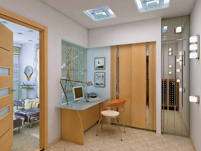 Зеркало, продолжающее перегородку со встроенным шкафом, не только служит по своему прямому назначению, но и зрительно увеличивает помещение кабинета, наполняет его светом