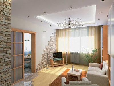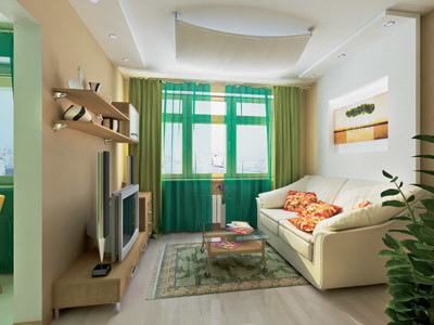Гостиная наполняется светом благодаря широкому проему, ведущему на кухню, воздушным занавесям на большом окне и подсвеченному потолку