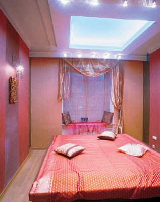 «Восточная» спальня, отделанная в духе «Тысячи и одной ночи». Расположение квадратной кровати (посередине помещения) «узаконено» таким же квадратным плафоном