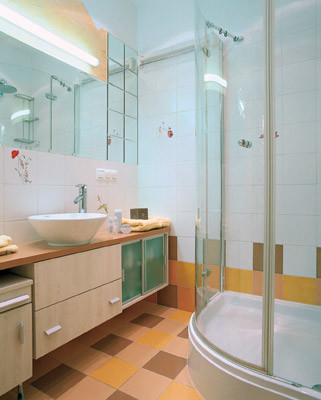 В новой ванной комнате нет ванны- ее заменили более компактной душевой кабиной. Умывальник и мебель вокруг, шкафчики, полки и тумбочки- DURAVIT (Германия)