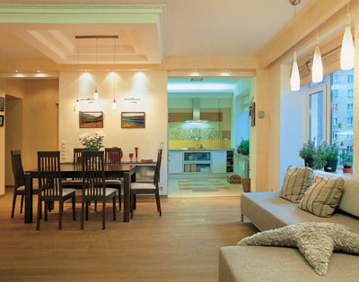 До переустройства пространство сегодняшней "студии" было разделено на три помещения- кухню и две жилые комнаты. Теперь появилось заказанное новыми хозяевами долгожданное большое, свободное пространство, освещенное дневным светом из трех окон. Вблизи кухни- зона столовой, а над ней- особенно щедро украшенный архитекторами потолок, решенный в духе классицизма с лепниной и подсветкой