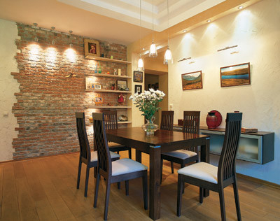 Кажется, что в зоне гостиной ремонт приостановили, заглядевшись на красоту старой, просоленной и растрескавшейся кирпичной кладки. На самом деле- это удачный декоративный прием. Характер поверхности каждой отделочной плитки, имитирующей кирпич, настолько разнообразен, что совершенно невозможно отыскать повторяющиеся, похожие плитки