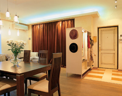 Раньше на месте зеркального шкафа-купе находился вход в маленькую тесную комнатку. Удалив перегородку, это помещение включили в общую "сценографию" большого пространства, отделив его портьерами, как сцену- кулисами. Вся мягкая мебель- «ФАБРИКА 8 МАРТА»