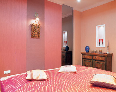 В этническом убранстве спальни есть и современные находки- четыре высоких зеркала по всем углам, в том числе по обе стороны окна, которое два раза в них и отражается