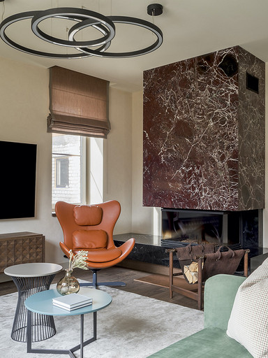 - Каминный портал: отделка мрамором Неро Мартино, Россо Леванте