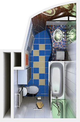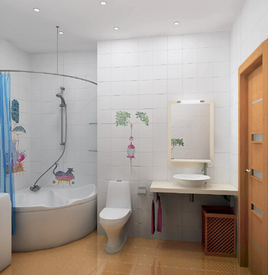 Трогательные рисунки на вставках из плитки, легкая, как облачко, голубая шторка в ванной комнате- все говорит о мечтательной и романтичной натуре обитателей квартиры