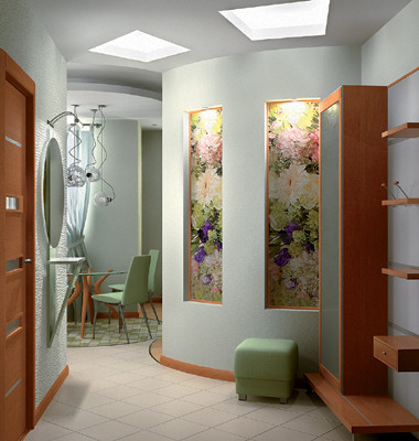 Глубокие проемы с подсветкой в подвесном потолке прихожей напоминают световые фонари- кажется,