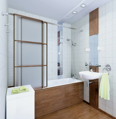 Ванная комната оформлена в стилистике яхты. Деревянный борт и палубный пол покрыты керамогранитом под дерево,