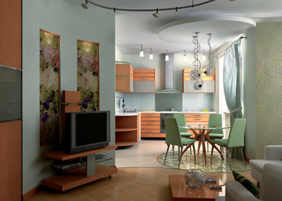 Многоцветная отделка кухни выглядит очень нарядно. Дверь в ванную находится в небольшой нише, так что не бросается в глаза и даже в открытом виде не мешает проходу