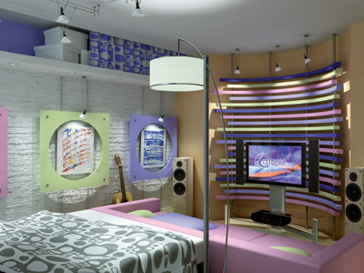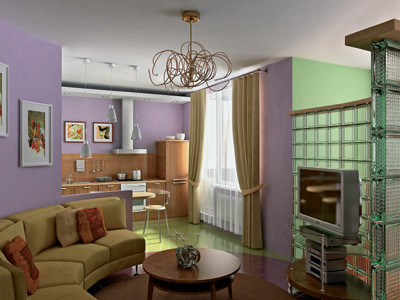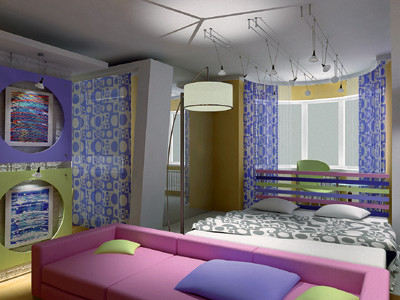 Вгостиной-спальне необходимо установить диван с низкой спинкой, чтобы он не мешал смотреть телевизор с кровати