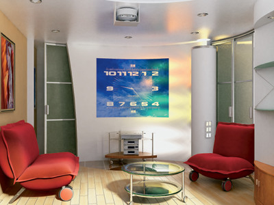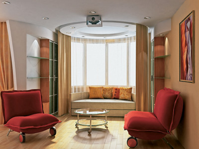 Немного изогнутая перегородка служит отличным экраном для домашнего кинотеатра, проектор которого подвешен к потолку
