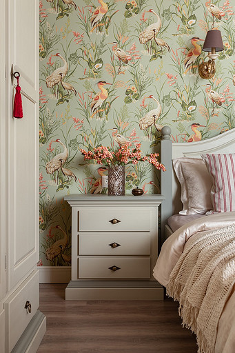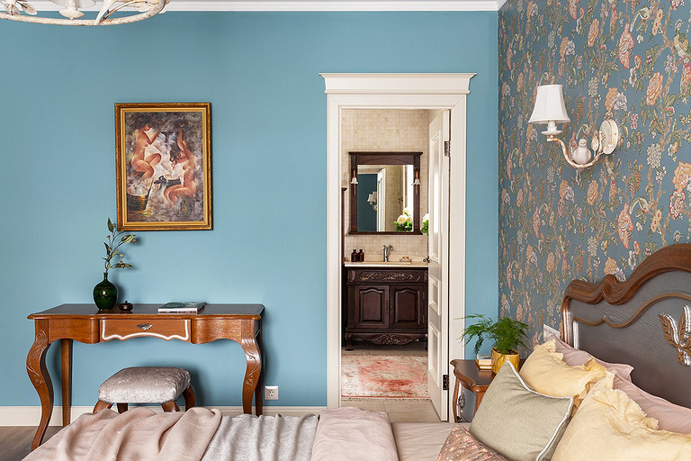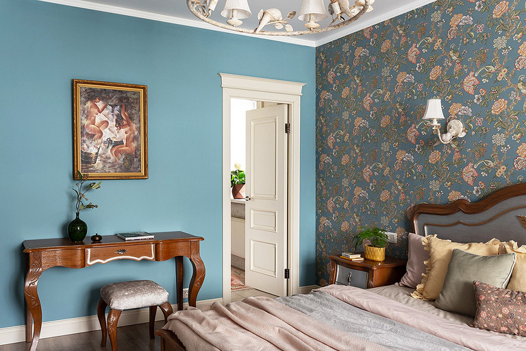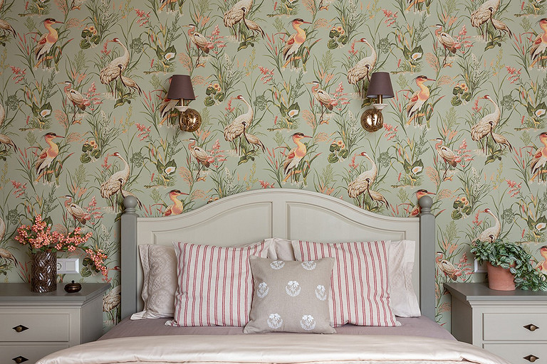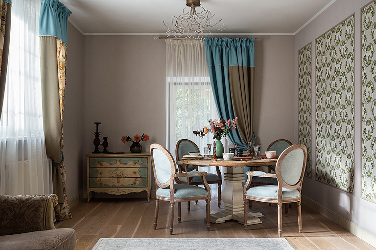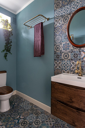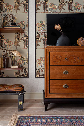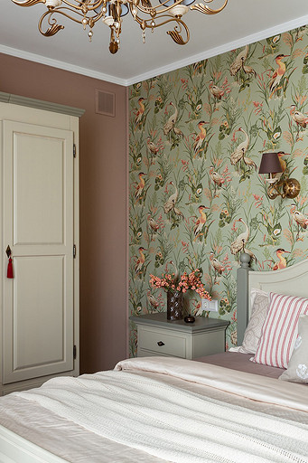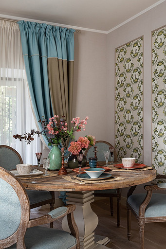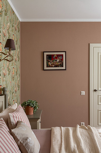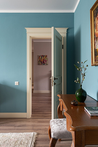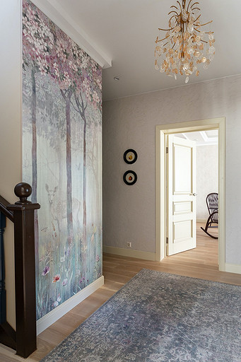 - Стены: прихожая — декоративная штукатурка, обои в спальне и кабинете York, обои в гостевой спальне Tibau, первый этаж — однотонные обои BN International в сочетании с цветными вставками внутри молдингов Cole&Son, коллекция Adore, второй этаж — обои под покраску Marburg, краска Tikkurila, кухонный фартук — плитка Kerama Marazzi