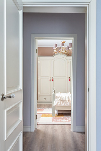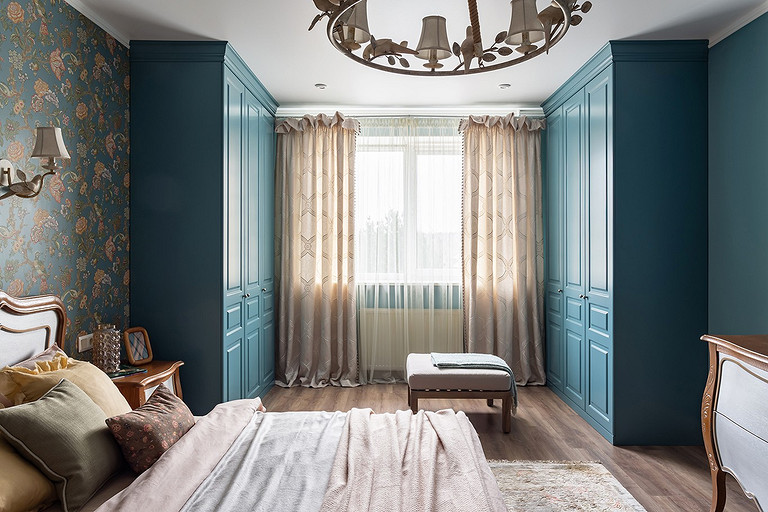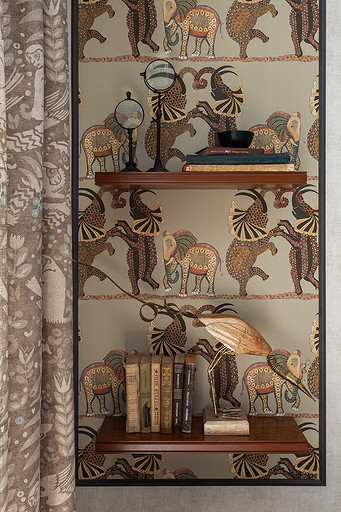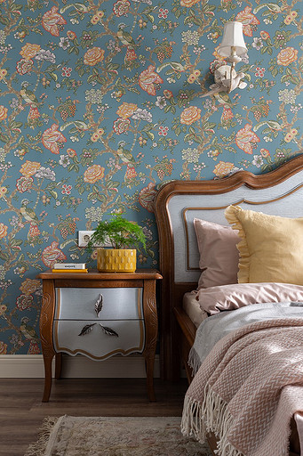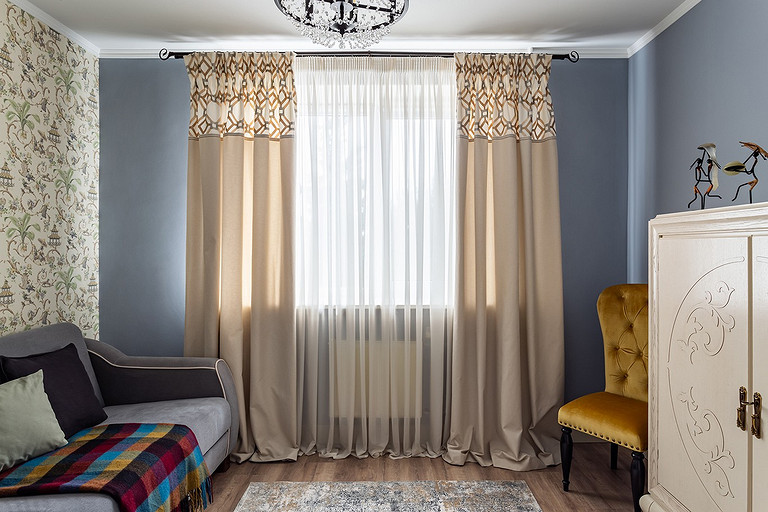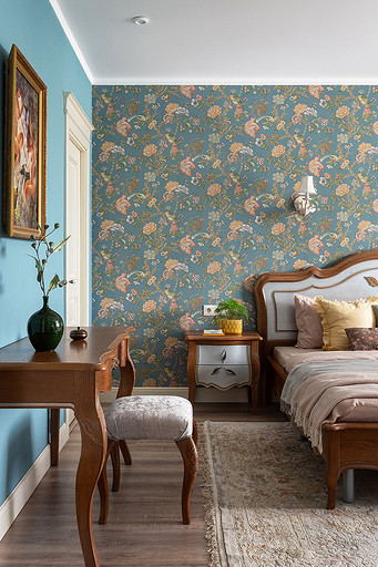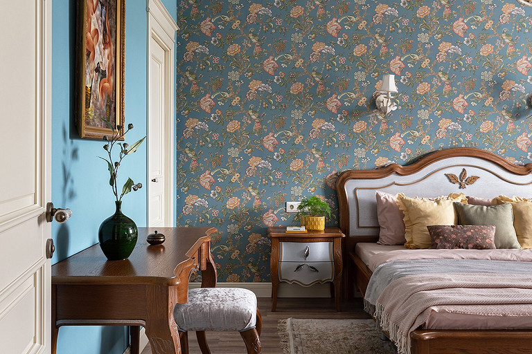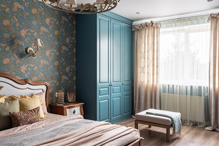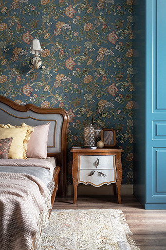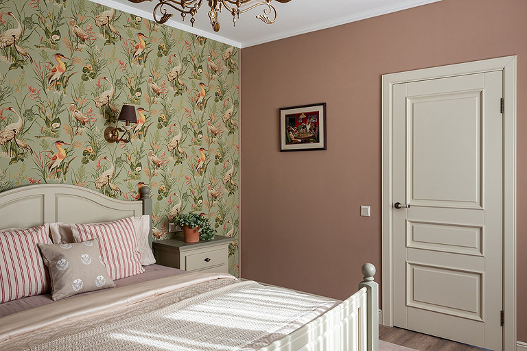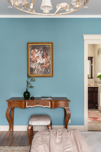 - Стены: прихожая — декоративная штукатурка, обои в спальне и кабинете York, обои в гостевой спальне Tibau, первый этаж — однотонные обои BN International в сочетании с цветными вставками внутри молдингов Cole&Son, коллекция Adore, второй этаж — обои под покраску Marburg, краска Tikkurila, кухонный фартук — плитка Kerama Marazzi