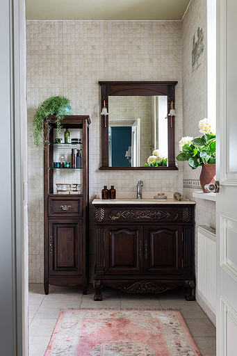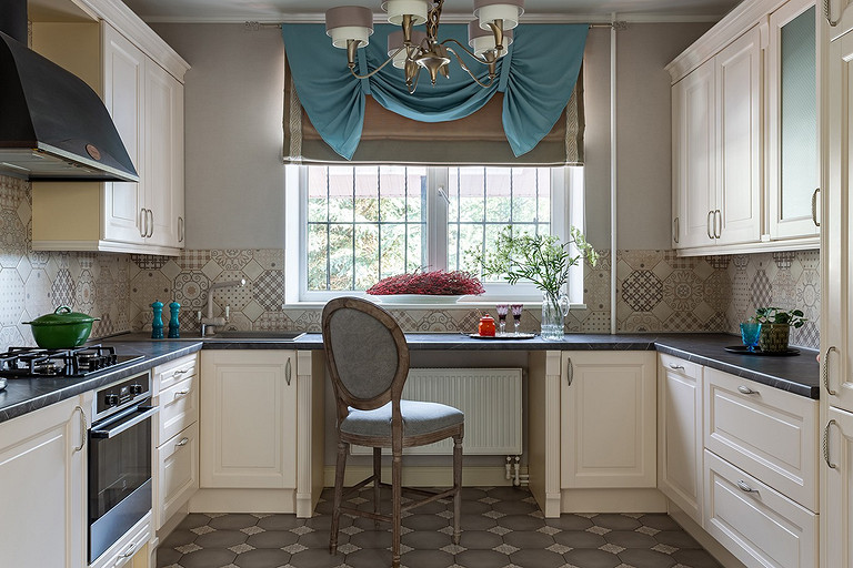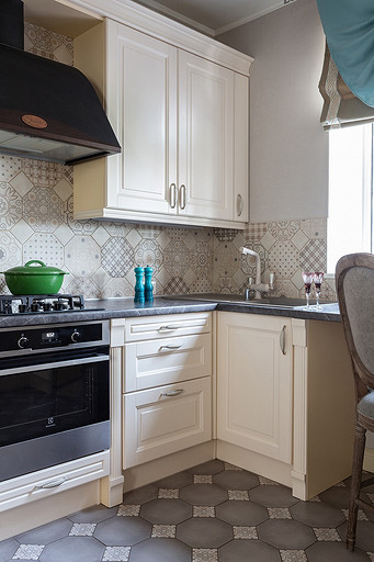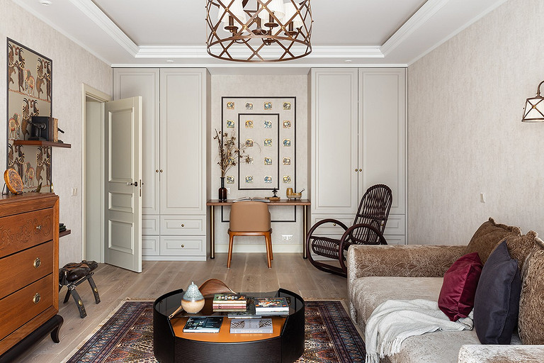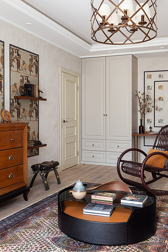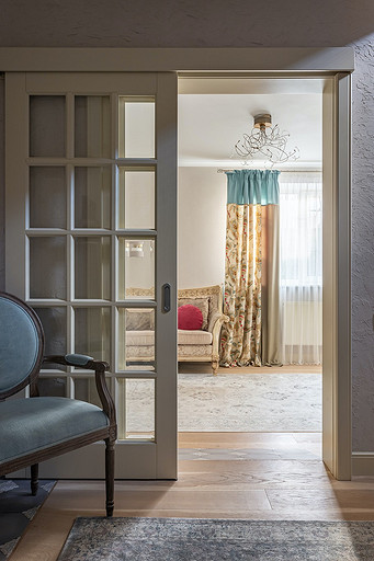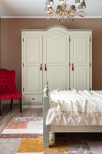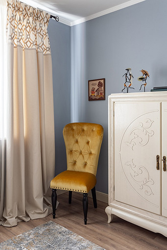 - Мебель: гарнитур кухонный «Эко Мебель», диванчик, комод, обеденный стол «Инлавка», комод и полки в гостиной, мебель в спальне хозяйки «Белфан», стулья и барный стул — Cosmorelax, шкафы встроенные — фабрика Tigrini