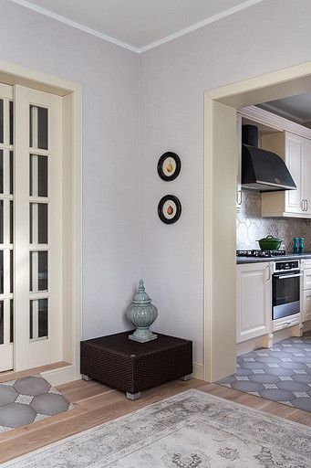 - Пол: паркетная доска Karelia, прихожая и кухня — плитка Kerama Marazzi