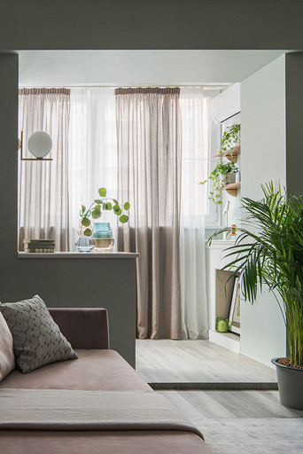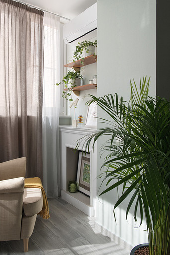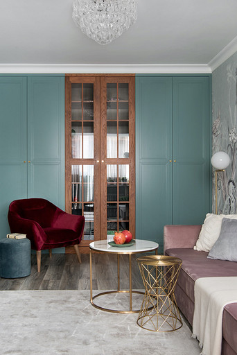 - Мебель: диван Garda Decor, столик мраморный LeHome, столик латунный Barcelona Design, ковер La Redoute, шкаф и тумба под ТВ — на заказ в мастерской Sotis, кресло MD House, пуфик SK Design, на лоджии кресло и пуф ИКЕА